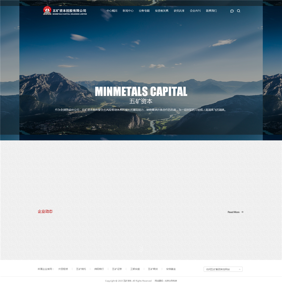 設(shè)計理念:五礦資本的網(wǎng)站是Html5的響應(yīng)式網(wǎng)站,采用此種方式進行網(wǎng)站建設(shè),瀏覽首頁就給人以身臨其境的感覺,延伸視覺效果,適合了大眾的審美的同時淋漓盡致的展現(xiàn)了其品牌文化。