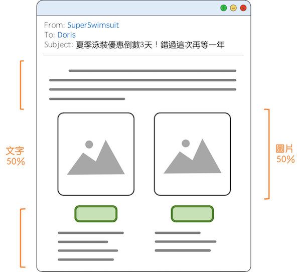 因此,在內容上取得圖片與文字的平衡會是比較好的策略,電子郵件內容適合的圖片與文字比例,大約是5:5 到6:4 左右,一方面可以保持圖片設計帶給讀者的豐富感受,透過圖像顯示縮短讀者閱讀信件所花的時間,另一方面當在圖片無法正確顯示的情況下,讓讀者對于電子郵件內容的理解達到最大。