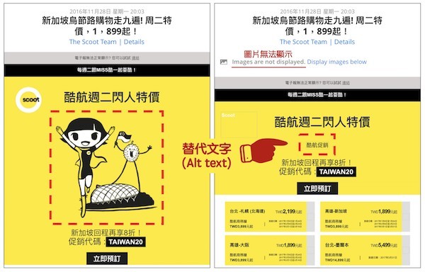 除此之外,替圖片加上替代文字(alt text)是一個設計電子郵件的好習慣,這種防御型設計可以讓電子郵件在圖片尚未顯示或是無法正確顯示的情況下,仍然維持一定程度的可讀性。