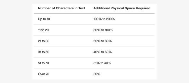 IBM’s globalization 網(wǎng)站中有個非常有用的表格,上方告知若要將英文翻譯成其他語言,需要的空間大概是多少。