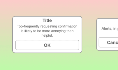 " 對(duì)話框 " 是一種以文字與使用者對(duì)話的使用者介面。其中,「警告對(duì)話框」(Alerts,以下簡(jiǎn)稱警告框)通常用于通知使用者發(fā)生了錯(cuò)誤或警告,并詢問接下來的操作(同意、不同意等等)。使用警告框時(shí)必須十分注意,因?yàn)槭褂谜卟⒉幌M谶M(jìn)行中的工作受到打擾。